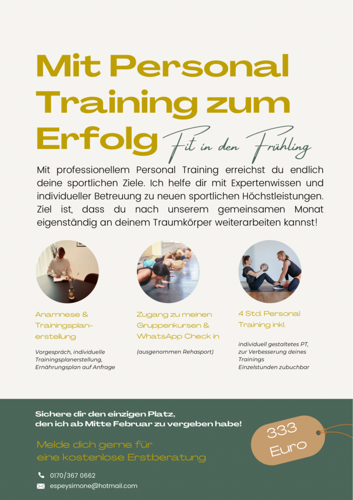 Nach einem ausführlichen Anamnesegespräch erstelle ich einen maßgeschneiderten Trainingsplan, der exakt auf deine Bedürfnisse und Ziele abgestimmt ist. In meinem 1-monatigen Personal Training Paket bekommst du alles an die Hand, was du brauchst, um eigenständig weiterzumachen – mit dem richtigen Wissen, der passenden Technik und einer soliden Basis für langfristigen Erfolg.